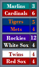 Rockies- Left-Fielder Matt Holliday went 2-for-3 with a home run and 2 RBI; Right-Fielder Brad Hawpe hit 3-for-3 with 2 doubles and 2 RBI; Starting Pitcher Aaron Cook pitched two scoreless innings, allowing one hit and struck out one.