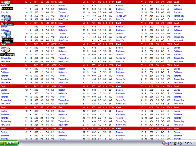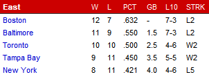 Boston Red Sox: '07- 12-7 (19 games); Started 12-7 last year, finished 86-76; Started 13-6 in '05, finished 98-64 and won the World Series; Started 13-6 in '03 and finished 95-67, losing in the ALCS; Have won at least 10 of first 19 games every year since 1997- they started 4-15 in '96.